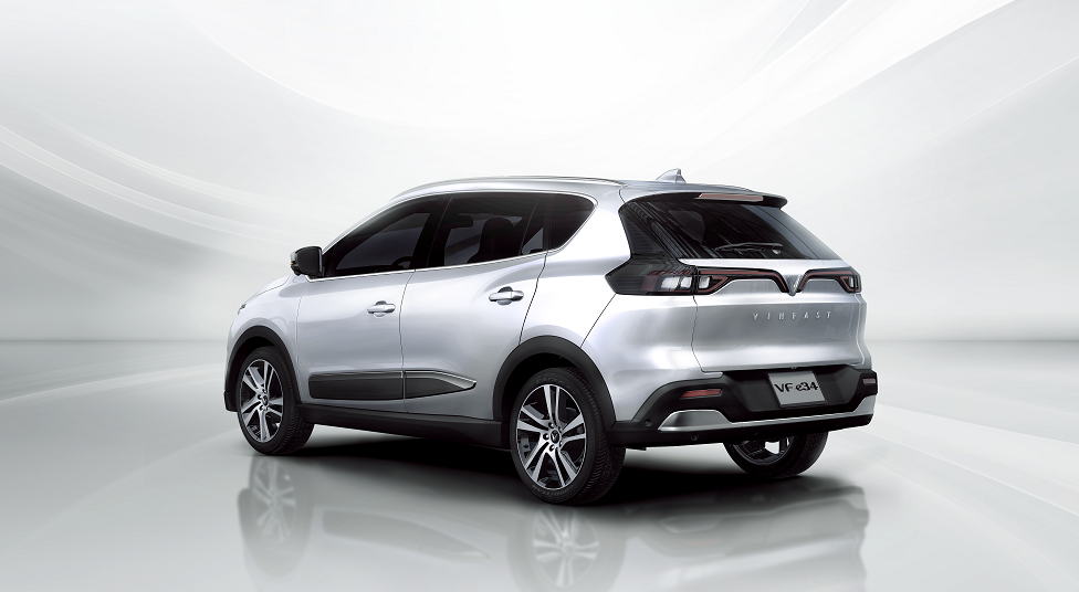 Nhìn từ phía sau, Vinfast xe điện e34 khiến khách hàng dễ dàng liên tưởng đến chiếc Lux SA2.0 với dải đèn hậu LED liền mạch tạo hình chữ “V”. Bên trong là cấu trúc 3 bóng LED quen thuộc. Tạo thêm điểm nhấn cho đuôi xe là thanh nẹp kim loại sáng bóng tại khu vực cản sau, phía trên còn có cánh lướt gió góp phần cải thiện tính khí động học.